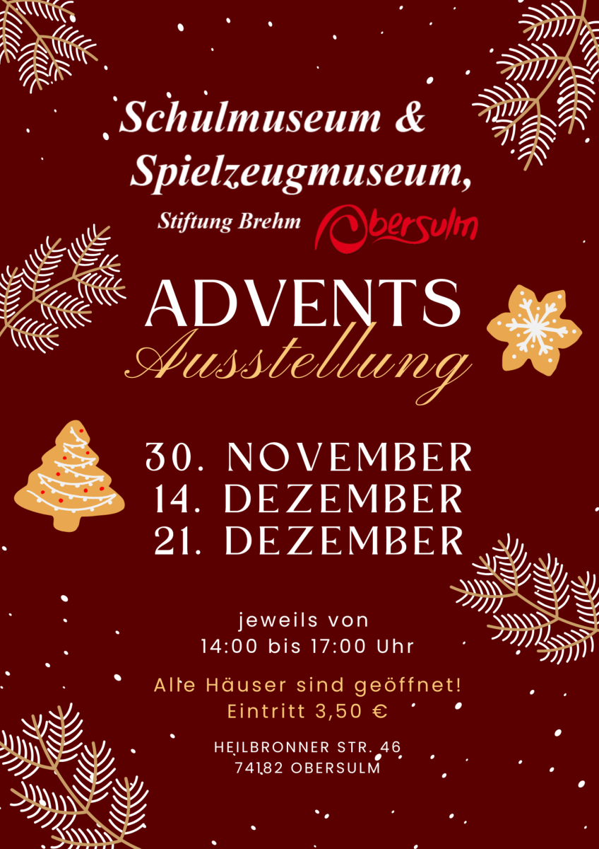 Das Schul- und Spielzeugmuseum lädt herzlich zur diesjährigen Adventsausstellung ein. Am 30. November, 14. Dezember und 21. Dezember 2025, jeweils von 14:00 bis 17:00 Uhr, sind alle Häuser geöffnet.