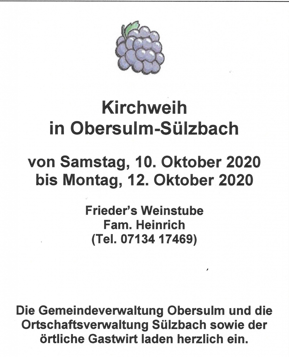 Die Gemeindeverwaltung Obersulm, die Ortschaftsverwaltung Sülzbach und der örtliche Gastwirt, Frieder's Weinstube, laden herzlich ein.