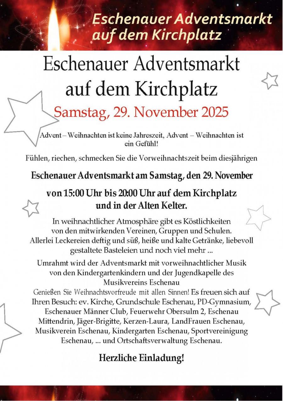 Fühlen, riechen, schmecken Sie die Vorweihnachtszeit beim diesjährigen Eschenauer Adventsmarkt am Samstag, den 29. November von 15:00 Uhr bis 20:00 Uhr auf dem Kirchplatz und in der Alten Kelter.