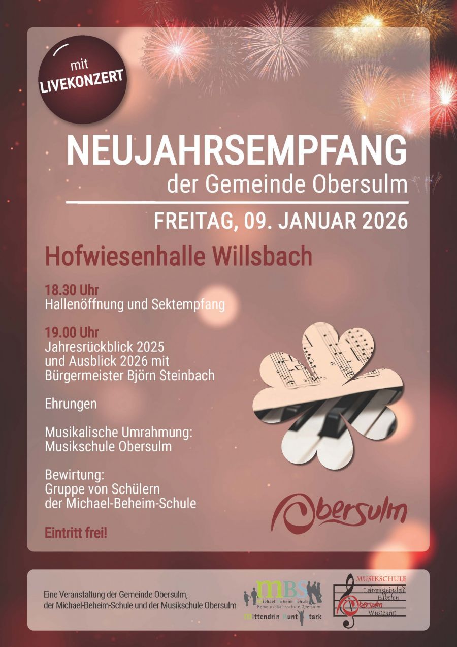 Am Freitag, den 9. Januar 2026 findet um 19 Uhr in der Hofwiesenhalle in Obersulm-Willsbach der Neujahrsempfang der Gemeinde Obersulm statt.