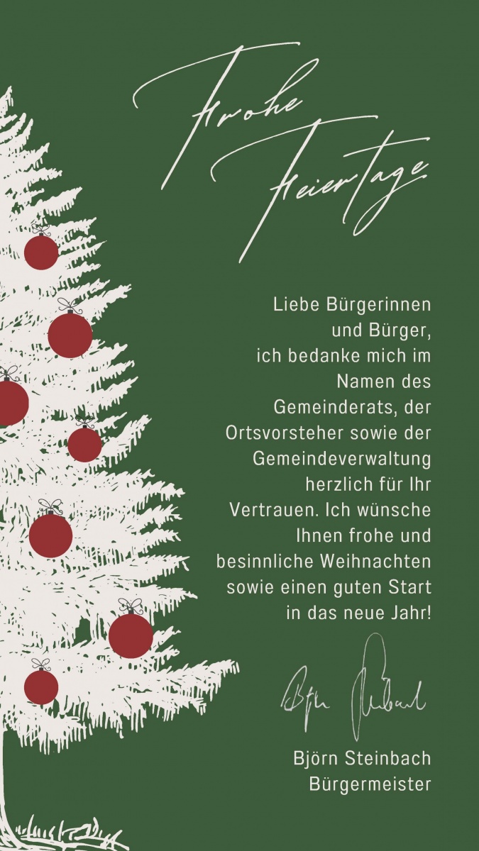 Bürgermeister Björn Steinbach, alle Gemeinde- und Ortschaftsräte, sowie Ortsvorsteher und -vorsteherinnen und alle Mitarbeiterinnen und Mitarbeiter der Gemeindeverwaltung Obersulm wünschen ein frohes und besinnliches Weihnachtsfest und viel Glück im Neuen Jahr!