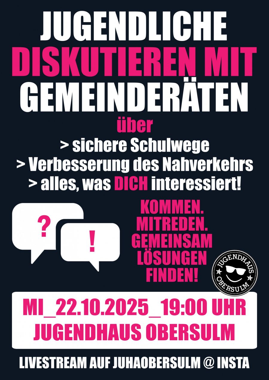 Am Mittwoch, 22.10.2025 sind Jugendliche und junge Erwachsene eingeladen, gemeinsam mit Obersulmer Gemeinderäten ihre Ideen, Probleme und mögliche Lösungswege zu diskutieren. Dabei können sowohl jugendspezifische als auch allgemeine kommunalpolitische Themen angesprochen werden.