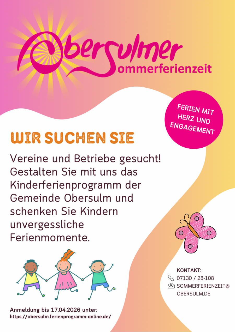 Durch das große Engagement zahlreicher Vereine und Institutionen ist das Obersulmer Kinderferienprogramm zu einem festen Bestandteil der Sommerferien geworden. Das Kinderferienprogramm soll in diesem Jahr vom 30. Juli bis 13. September 2026 angeboten werden.