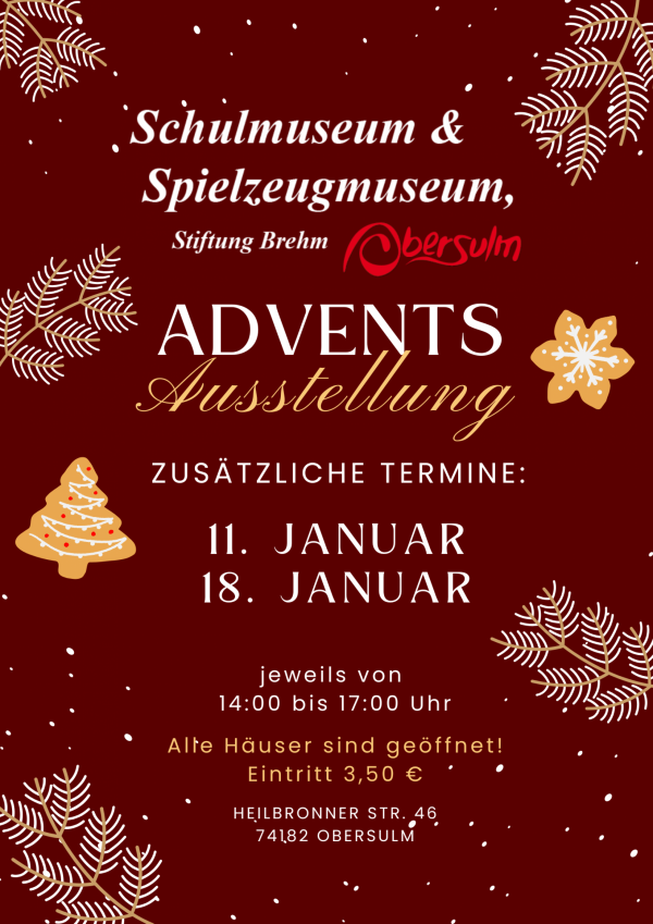 Das Schul- und Spielzeugmuseum lädt herzlich zur diesjährigen Adventsausstellung ein. Nach den bereits vergangenen Terminen am 30. November, 14. Dezember und 21. Dezember 2025 ist die Ausstellung zusätzlich an den Sonntagen, dem 11. und 18. Januar 2026, jeweils von 14:00 bis 17:00 Uhr, geöffnet. weiterlesen